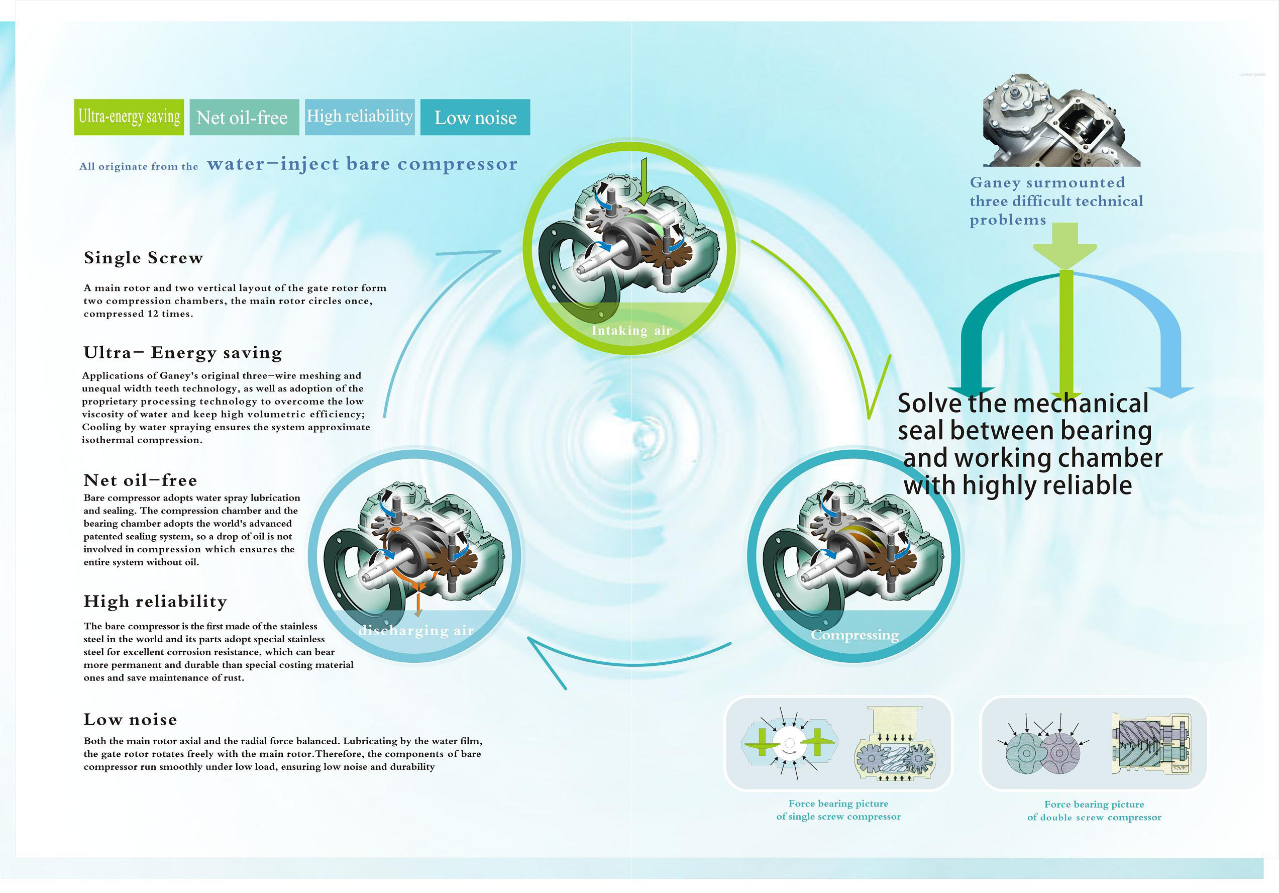 Top reliable: Worldwide initially exclusive anti-corrosive stainless-steel single screw air End with SKF bearing. ☆ Purely Oil-free: Water-injection Lubricates & seals the Air end, and apply the world-top patented sealing between the compressing & bearing’s chambers, assuring the whole system oil-free.